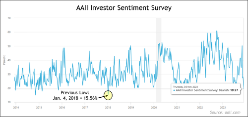 We now see bearish sentiment at its lowest level in 6 years according to the latest AAII data (individual investors sentiment survey). See the chart of '% Bearish' below, which is currently under 20% (chart via macromico.com):
