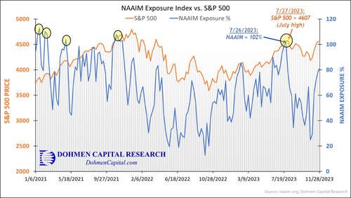 The yellow shaded areas indicate times the NAAIM Exposure was over 100%, with the most recent occurrence on July of this year, just before the 11% drop in the S&P 500 (although the broader indices suffered 16%-18% plunges).