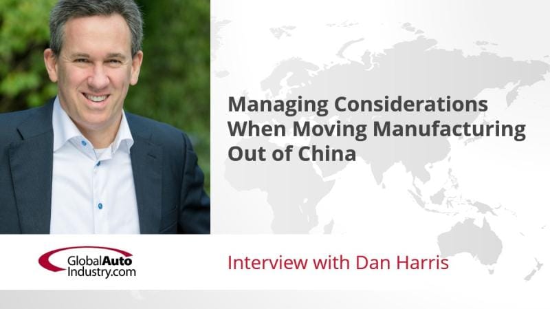 "'Managing Considerations When Moving Manufacturing Out of China' GlobalAutoIndustry.com Interview with Ron Hesse features Dan Harris. Mr. Harris is Founder & Managing Partner, and Head of China Manufacturing Practice with Harris Sliwoski, a leading international law firm.
