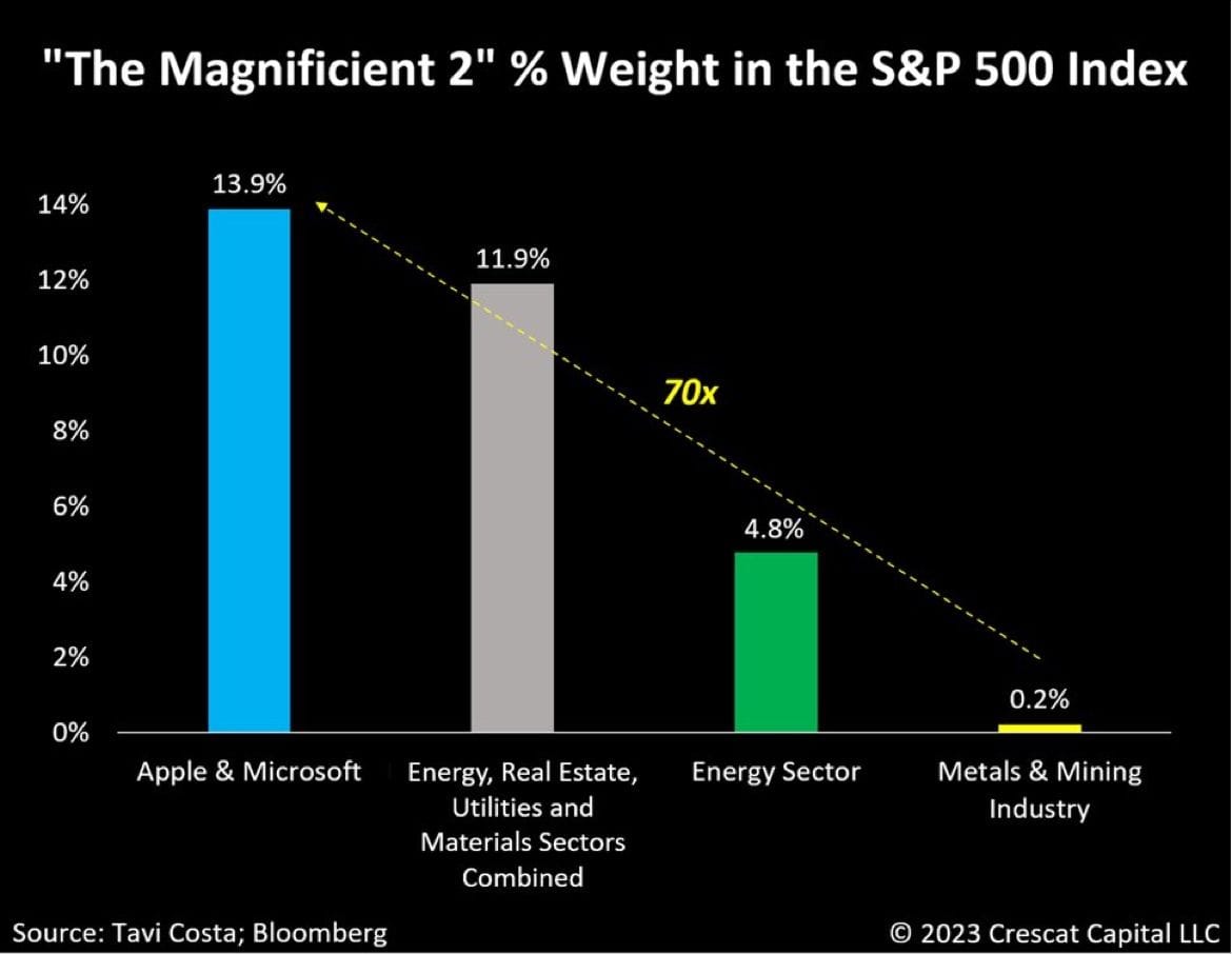 The aggregate weight of Apple and Microsoft in the S&P 500 index is now larger than 4 sectors combined, and 70x greater than the entire metals and mining industry.