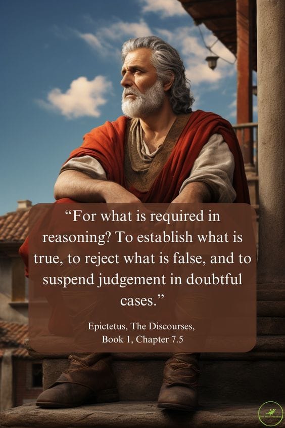 Stoic Study: “For What Is Required In Reasoning? To Establish What Is True, To Reject What Is False, And To Suspend Judgement In Doubtful Cases.” Epictetus R. Creighton Conley R. Creighton Conley Dec 1, 2023 ∙ 1 minute read The link has been copied!