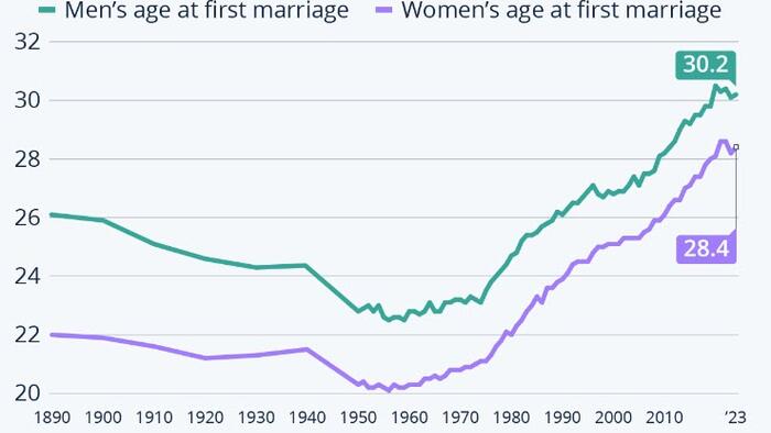 As Statista's Anna Fleck reports, the median average age for men to first get married has risen to 30.2 years in 2023, while for women the figure is 28.4 years.