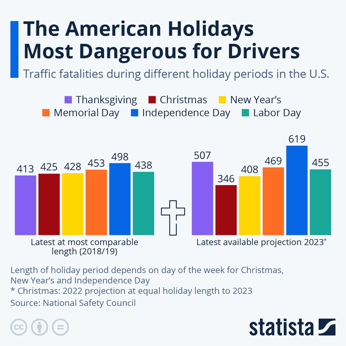 Due to fatigue, impaired, distracted or careless driving, Statista's Katharina Buchholz reports that traffic fatalities spike during holiday breaks every year.